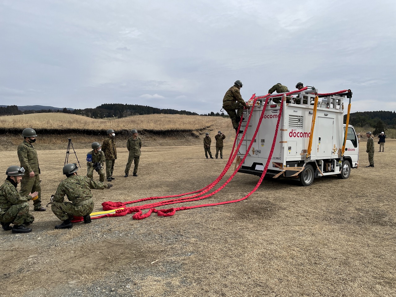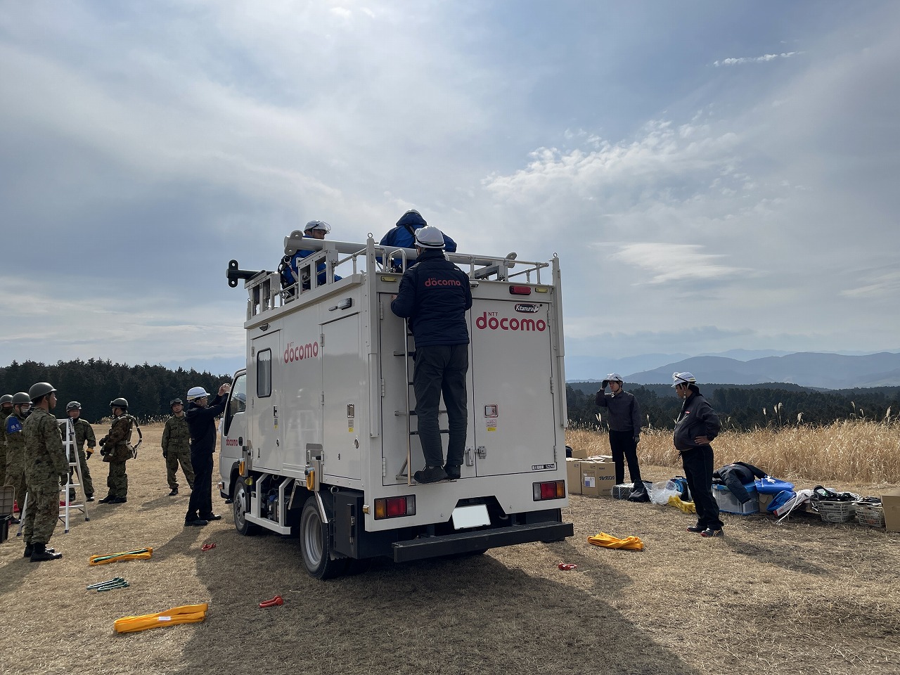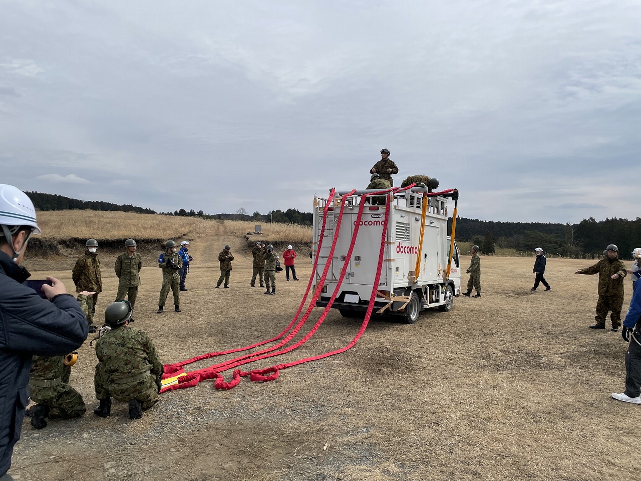 - 服部様/ドコモCS九州: 「空輸型多機能車」による、陸上自衛隊との共同訓練は今回が2年目であり、その有効性を実感しています。実際の災害復旧活動は時間との戦いといえます。その状況下で、陸上自衛隊といかにスムーズに連携を取り、迅速に対応するかが重要だと共同訓練を通じて、改めて実感しています。今後も継続して訓練を行うことでスキル向上と社員育成にも努めていきたいと思います。実際の運用はまだですが、災害地域の通信を早く復旧させるためにはこの車両が重要な役割を果たすと確信しています。訓練での気づきを次回の訓練に反映し、安全に遂行できるよう、引き続き御社と連携し対応していきたいと思います。今後とも宜しくお願い致します。