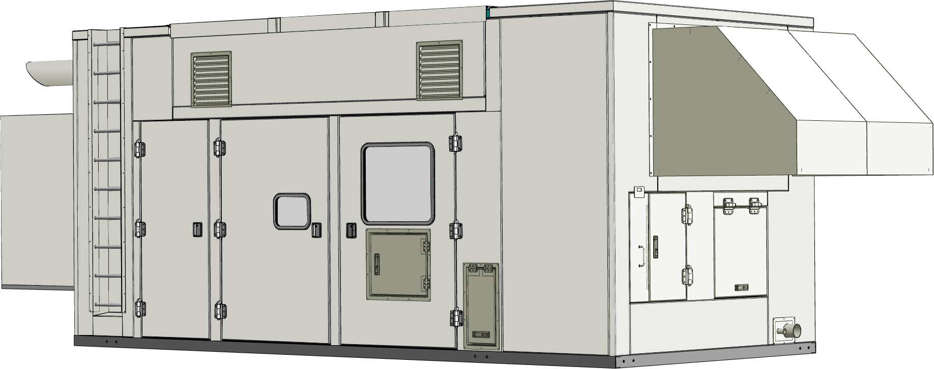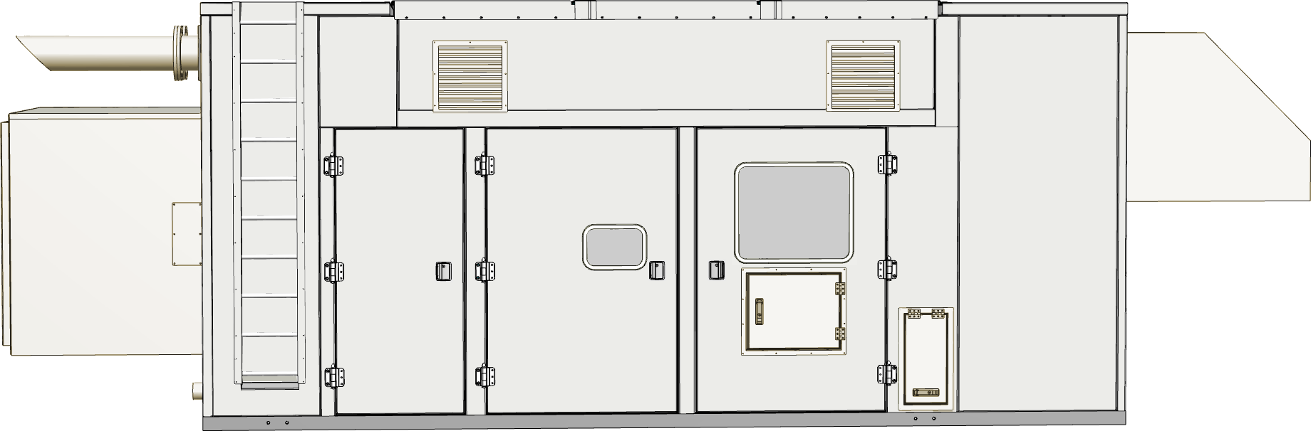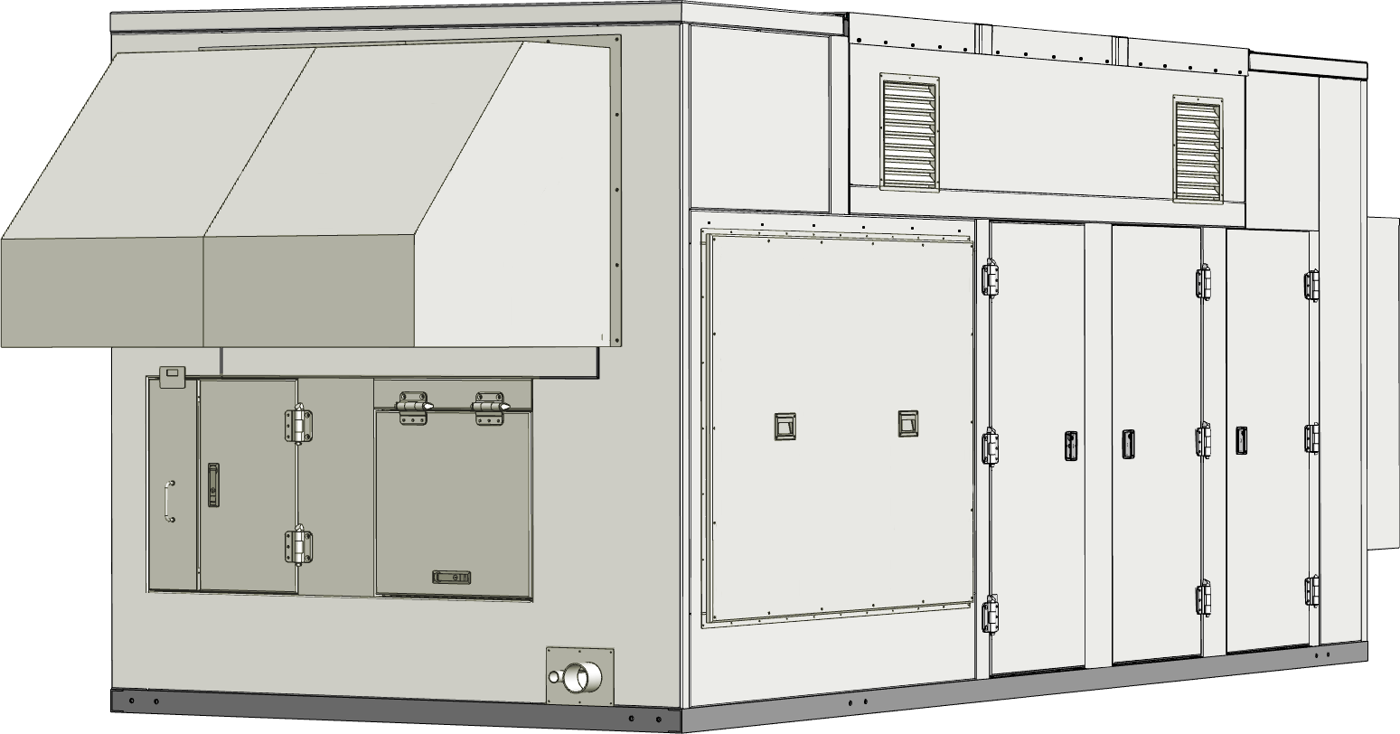 非常用発電設備を災害時にも安定して稼働させるために、自然災害に耐える堅牢な局舎が求められました。そこで、複数の点検用ハッチや片開き扉を備えることで保守性と利便性を確保した5Mサイズの局舎を設計・製作。沿岸部を含む多様な環境の使用にも耐えるよう、外装には耐候性の高いフッ素樹脂系塗装を施工。工場組立完成型工法を採用することで、安定した品質を維持しながら迅速な設置も可能としています。
