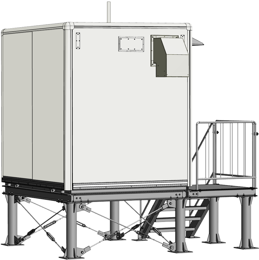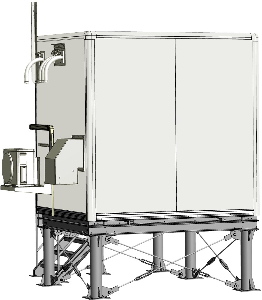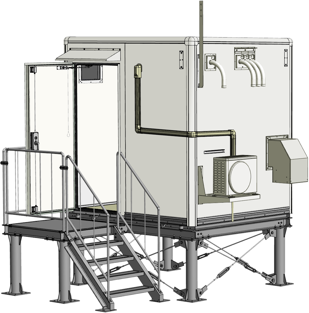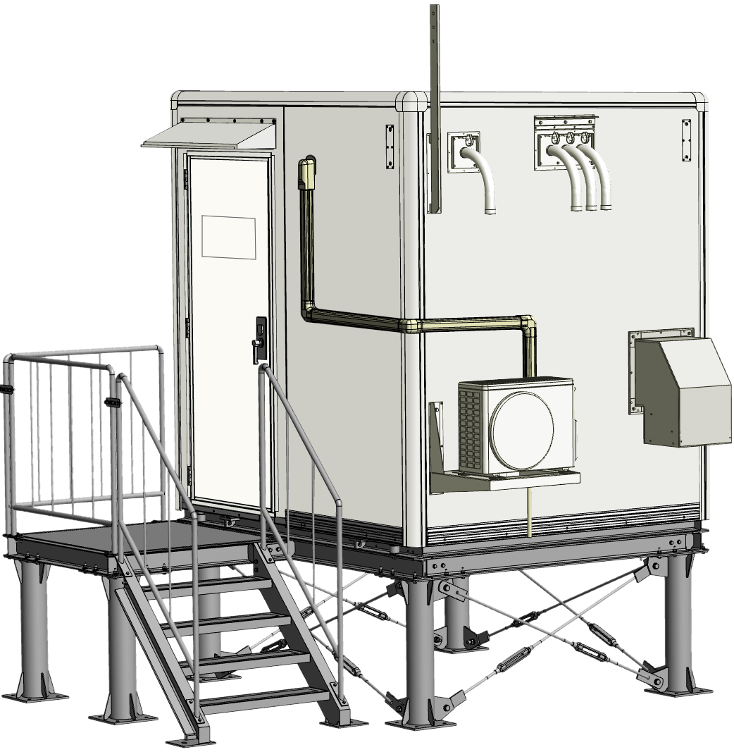 市町村向け防災行政無線システムを災害時にも確実に稼働させるために、信頼性の高い堅牢な基地局が求められました。そこで、耐震・防水性能を確保した2Mサイズの局舎を設計・製作。収容機器に合わせて分電盤や空調機、ケーブルラックを効率的に配置しました。鉄骨架台を使用した嵩上げ設置により、積雪や豪雨による浸水対策を強化。工場組立完成型工法により、短工期で高品質な施工を実現しています。