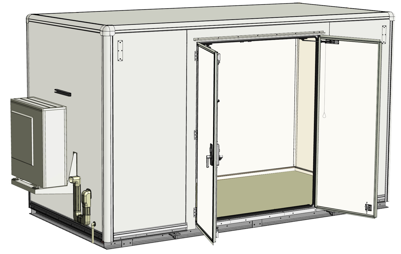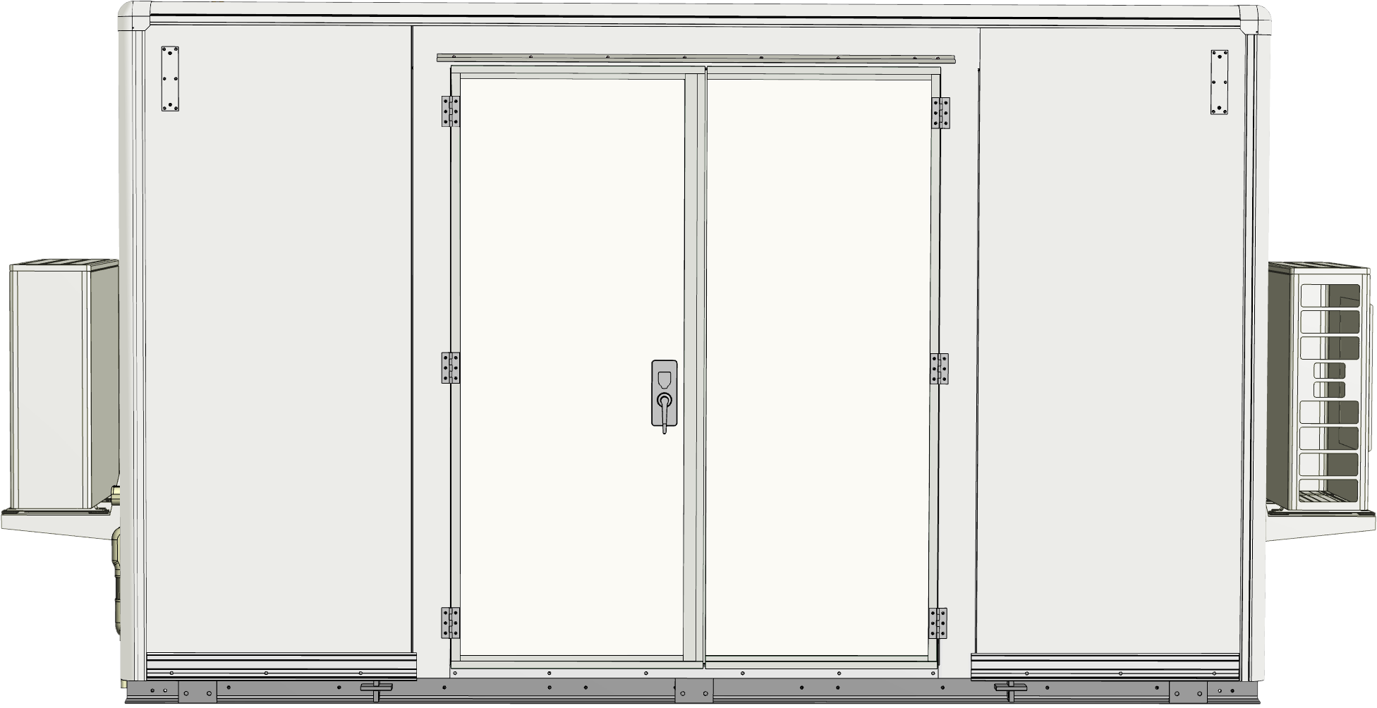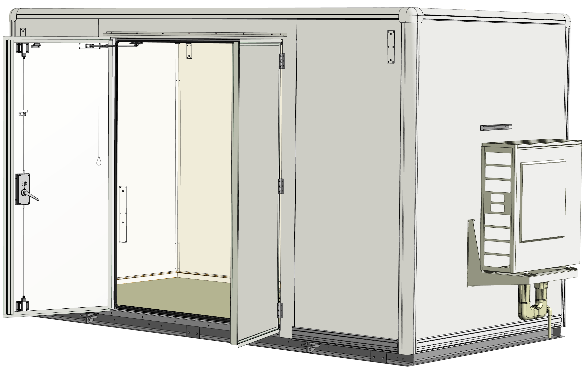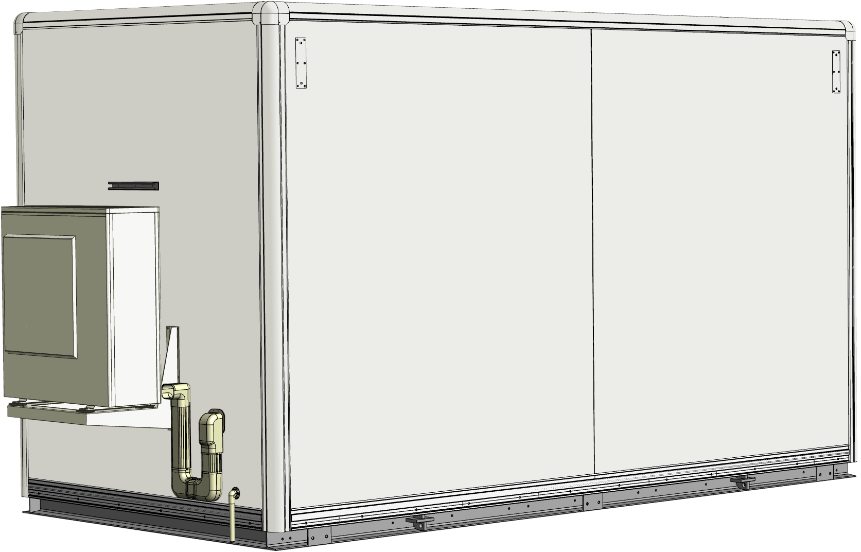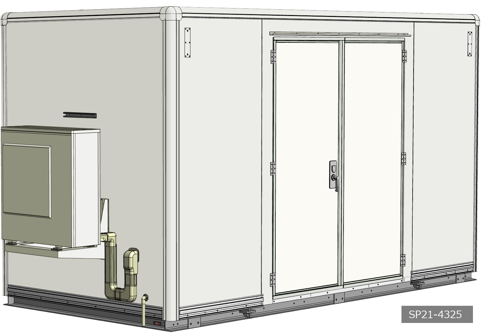太陽光発電所向けに、パワーコンディショナや周辺機器を安全かつ効率的に収容できる局舎が求められました。その要件に応えるため、高い耐震・防水性能を確保し、分電盤や空調機、火災報知設備を効率的に配置した4Mサイズの局舎を設計。外板にカラーアルミ板を使用することで耐候性を保ちながらコストダウンを実現。さらに、床下からケーブルを導入するための床貫通口と設置後のメンテナンスに活用する点検口を設けることで保守性を向上。上箱脱着方式を採用することで、施工時の室内機器の設置を容易にしています。