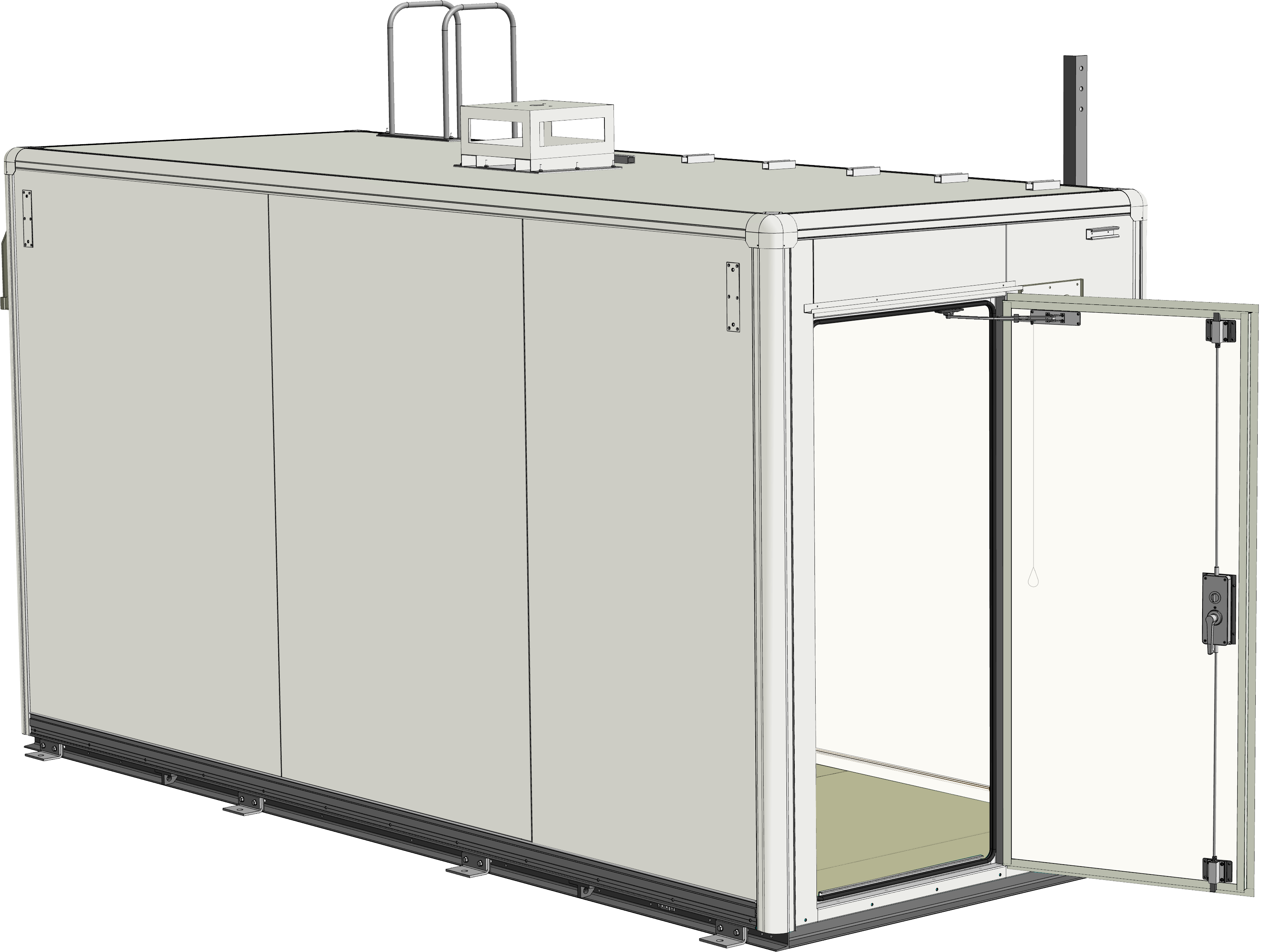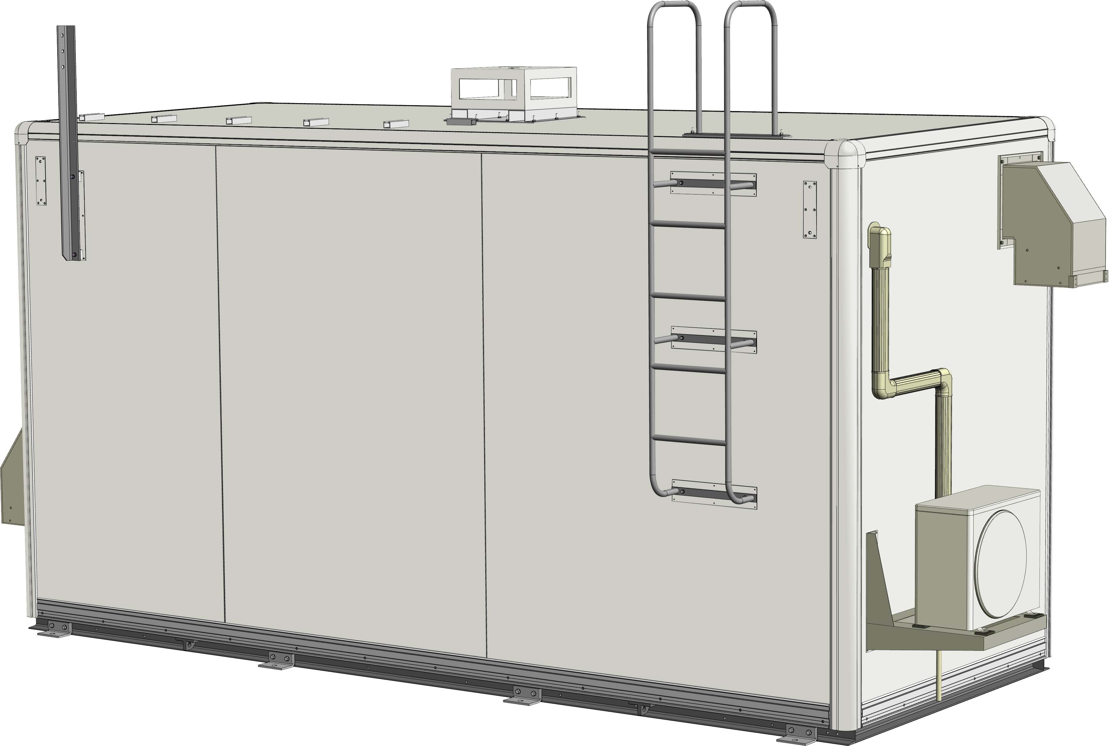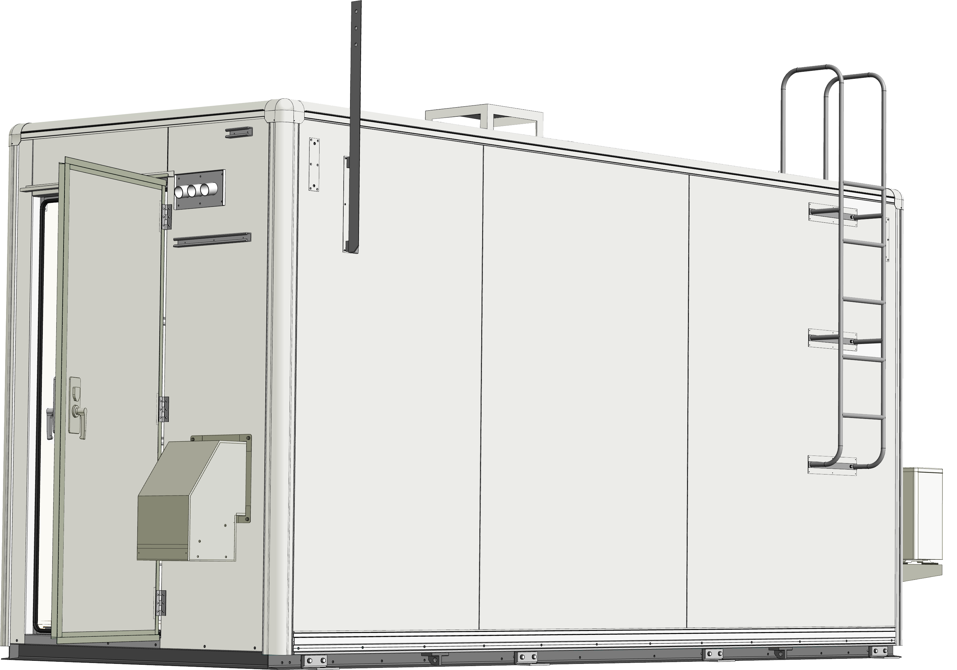河川近傍に設置される雨量・水位流量観測所では、あらゆる気象条件下でも安定稼働できる局舎が必要とされました。その要件に応えるため、収容機器に合わせた内部空間を確保した5Mサイズの局舎を設計・製作。高い耐震・防水性能を備えた局舎に、分電盤や空調機、換気設備を取り付け。さらに、雨量計設置用の架台と屋根上の保守のための梯子を装備しました。工場組立完成型工法により、安定品質と短工期での施工を実現しています。