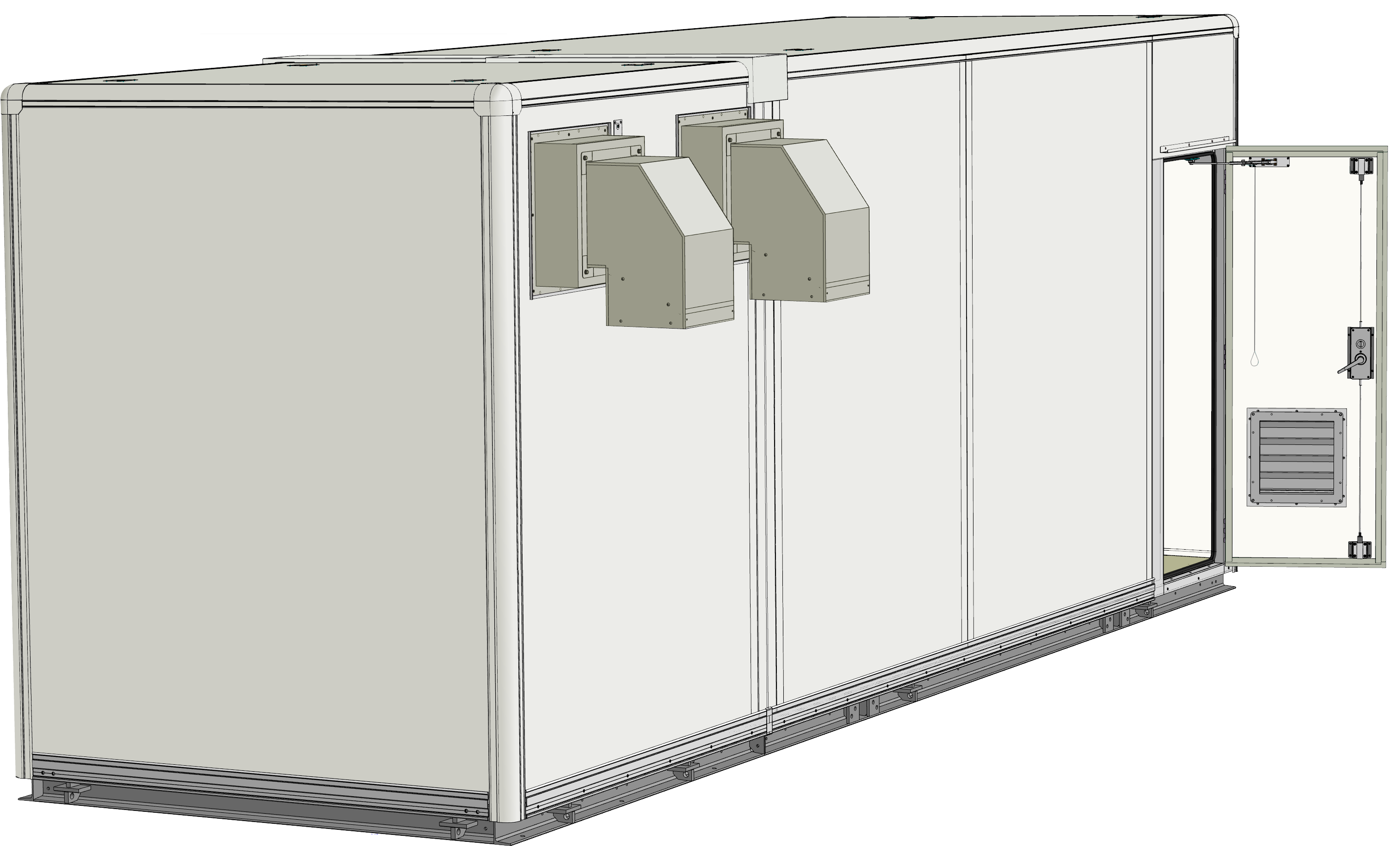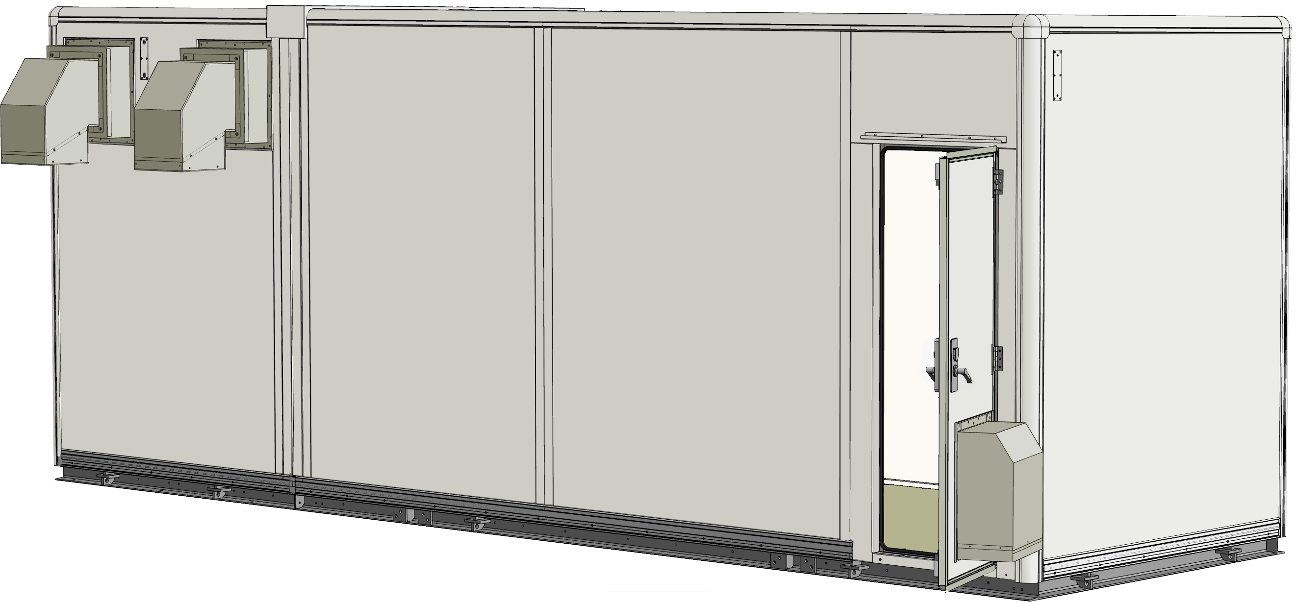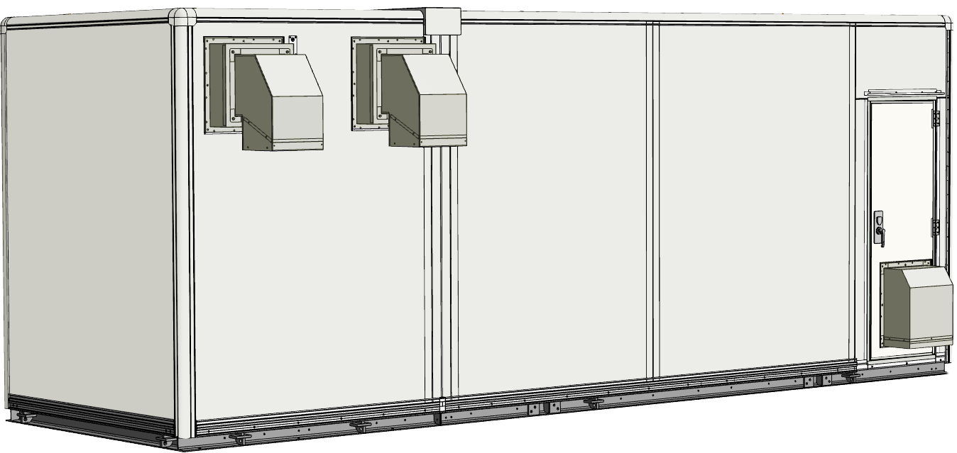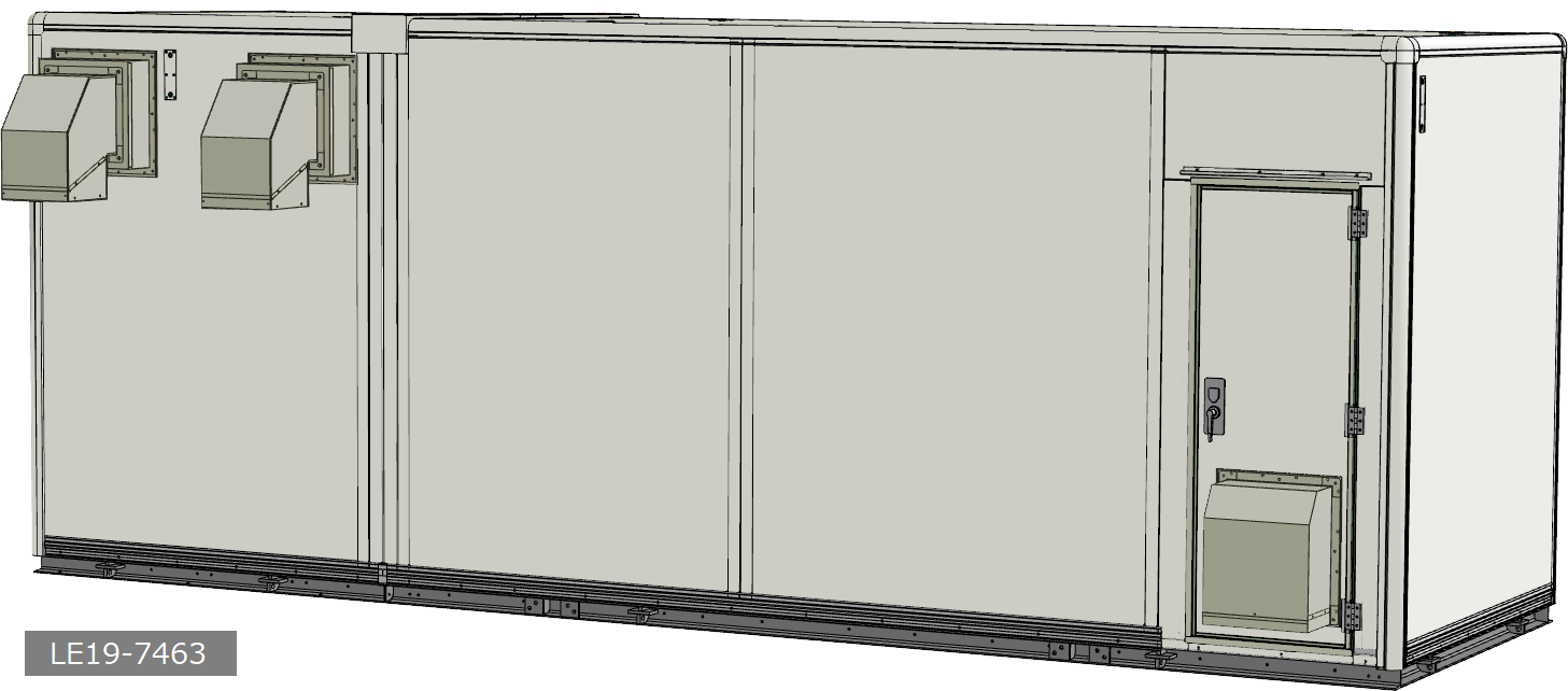 大規模工場やビル敷地内では、高圧受電設備を安全に収容できる耐久性の高い局舎が必要とされました。そこで、耐震・防水性能を備えた7Mサイズのシェルターを設計・製作。換気設備や火災報知設備を装備することで安全で安定した稼働をサポートします。分割搬入型工法により効率的かつ確実な現地施工を可能にしています。また、上箱脱着方式を採用することで室内機器の搬入・設置を容易にしています。