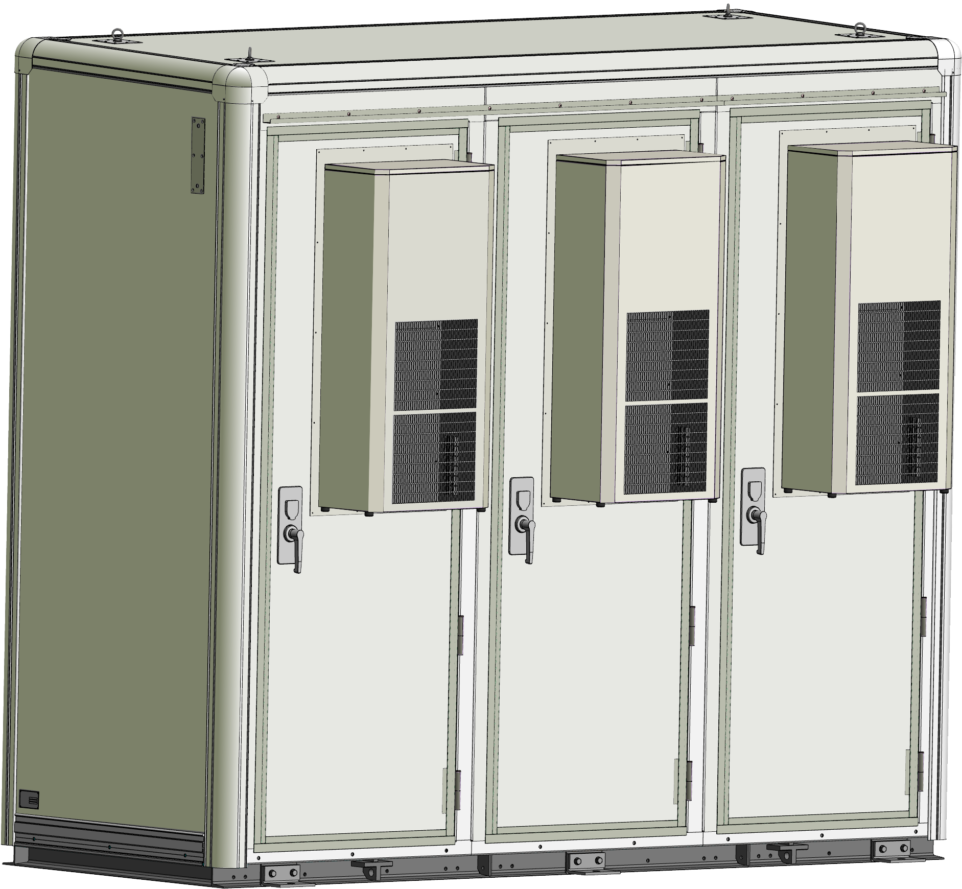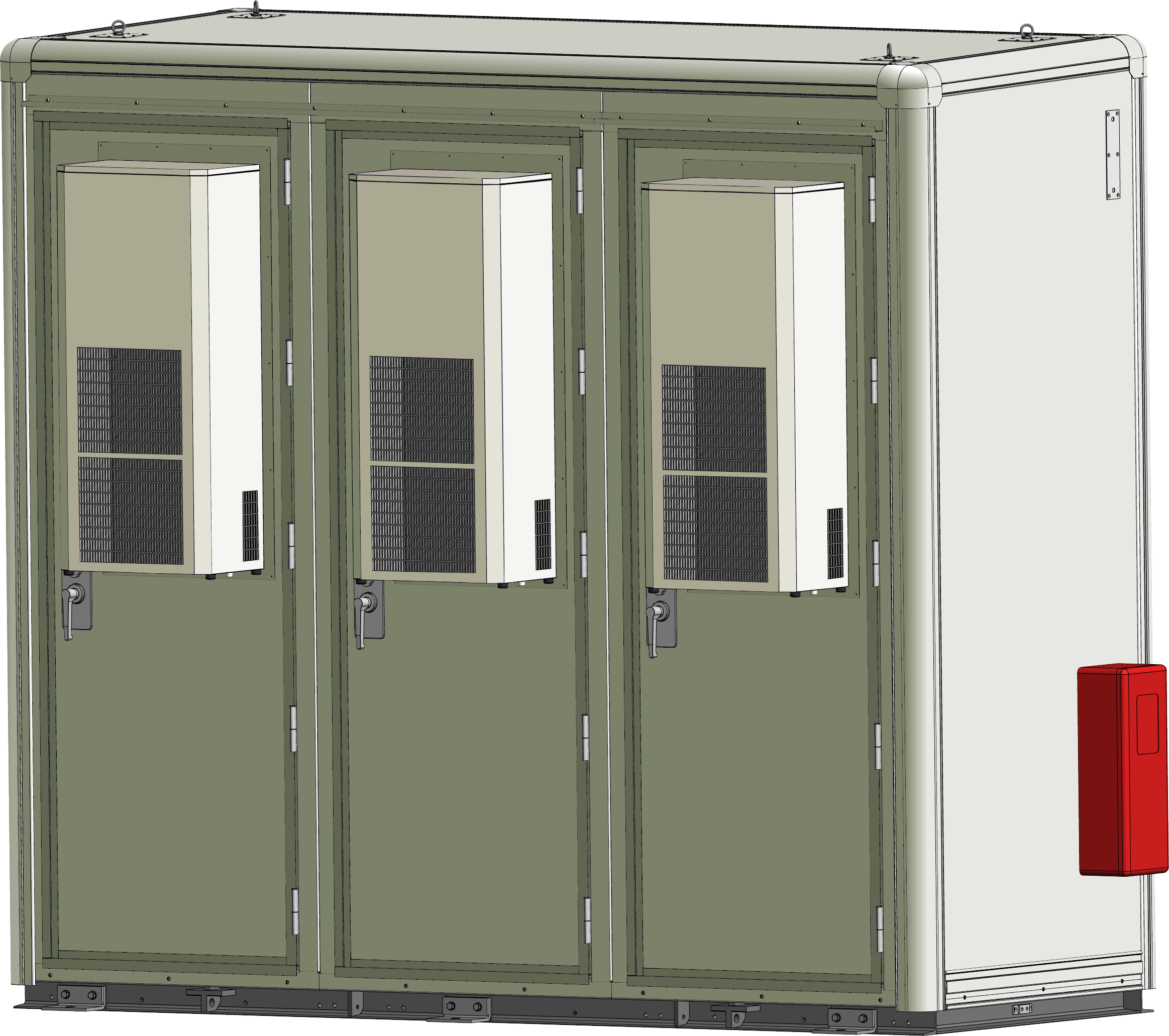 公共施設などでの安定した電源供給を確保するため、設置場所の限られたスペースに合わせたサイズで産業用蓄電池やUPSを安全かつ効率的に収容できる局舎が求められました。その要件に応えるため、人が室内に入らずに外から点検・保守をする外メンテ方式のコンテナを設計。屋外コンプレッサクーラを採用しコンパクトかつ耐震・防水性能を備えた仕様で製作しました。観音開き式と片開き式の2種類の扉を配置して作業性を高め、消火器を装備することで安全性も確保。現地組立型工法を採用することで、搬入路や設置環境に応じた柔軟かつ確実な施工を実現しています。