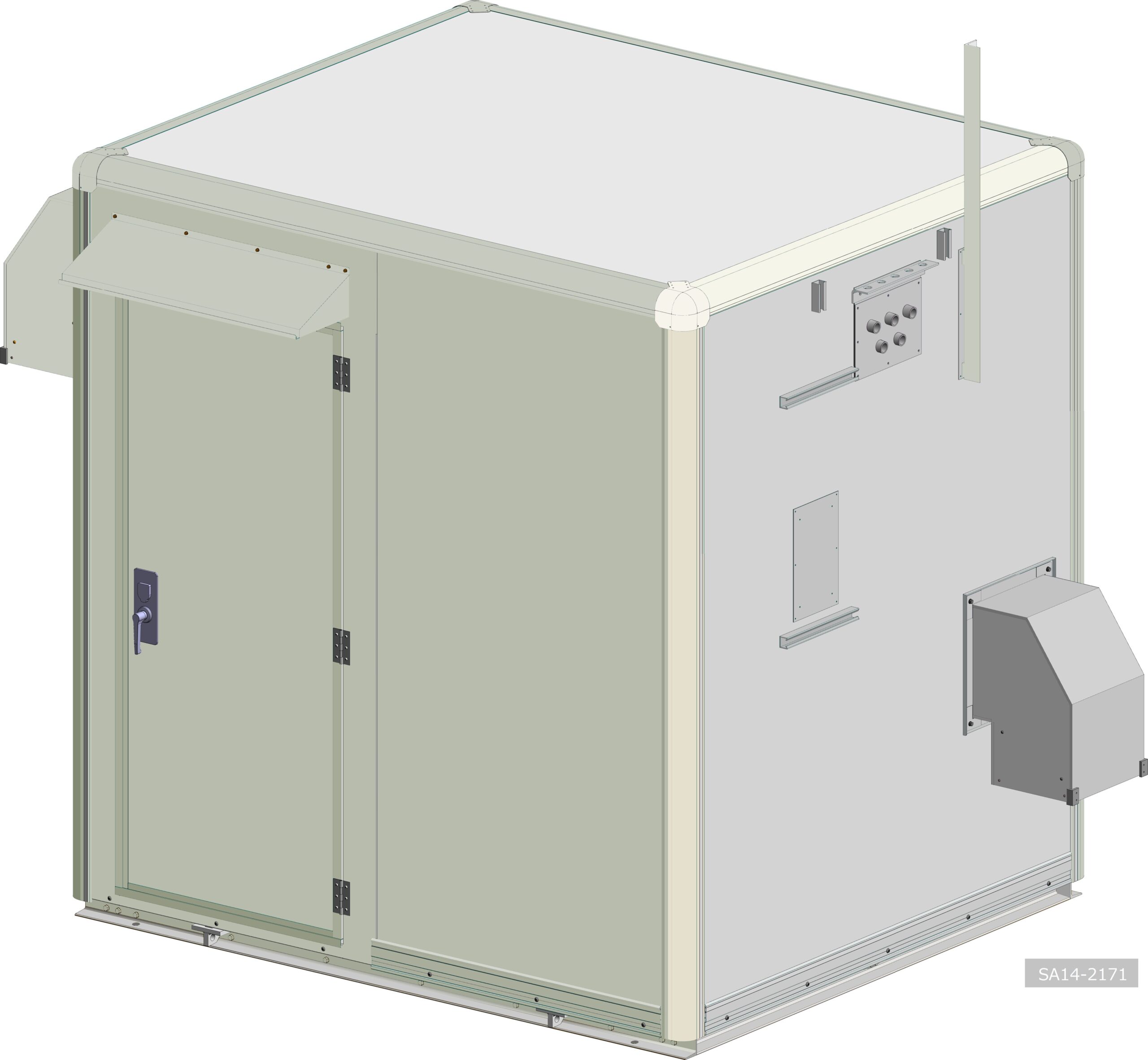 河川や湖、沿岸部に設置される水位観測用機器を安定して稼働させるために、コンパクト、かつ設置場所の環境に耐えられる局舎が求められました。そこで、2Mサイズの局舎を設計し、耐震・防水性能を確保。日射による室内の温度上昇を抑える、断熱性能の高いパネルで構成された局舎に、換気設備を設けて室温を調整します。工場組立完成型のため現地設置作業も短時間で完了します。