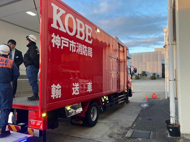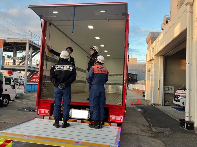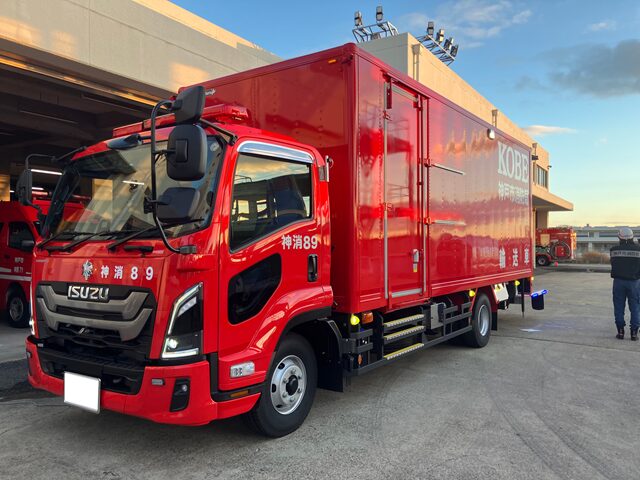 神戸市消防局様の輸送車/資機材搬送車は、緊急出動で初動対応に向かう車両ではなく、平時には各消防署への物品搬送や近隣本部への資機材搬送に使われています。頻繁に稼働する車両ではありませんが、大規模災害時には、緊急消防援助隊の派遣に必要な資機材や物資の搬送を担う場面もあります。今回の更新で一度に運べる量が増えたことで、搬送回数の抑制や搬送業務の効率化にもつながっています。