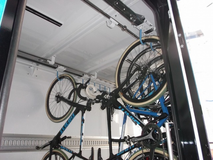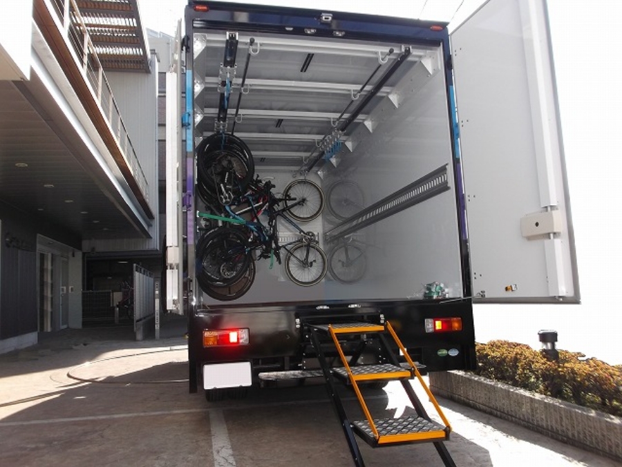 北村製作所では、営業担当が運搬台数や作業の流れ、保管方法、走行ルートといった運用条件を確認し、自転車を屋根付き荷室に吊り下げて一台ずつ固定できる車両をオーダーメイドで設計・製作しています。
