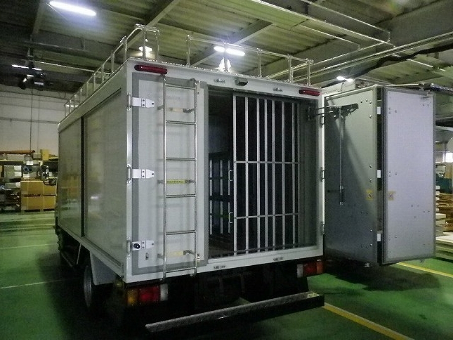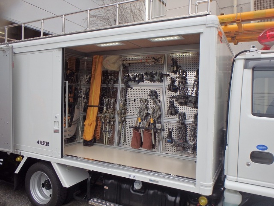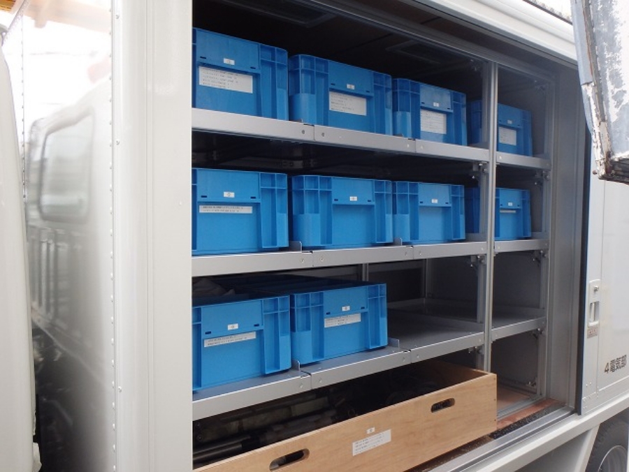北村製作所では、営業担当が工具量や出動頻度、現場までの進入路条件などを事前に確認し、用途別に工具の置き場所を固定できる収納室や、消耗品・小部材を常備できるパーツ室を備えた車両をオーダーメイドで設計・製作しています。