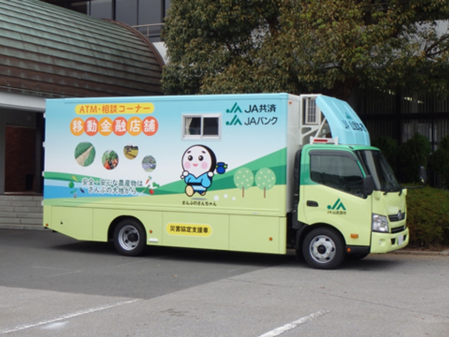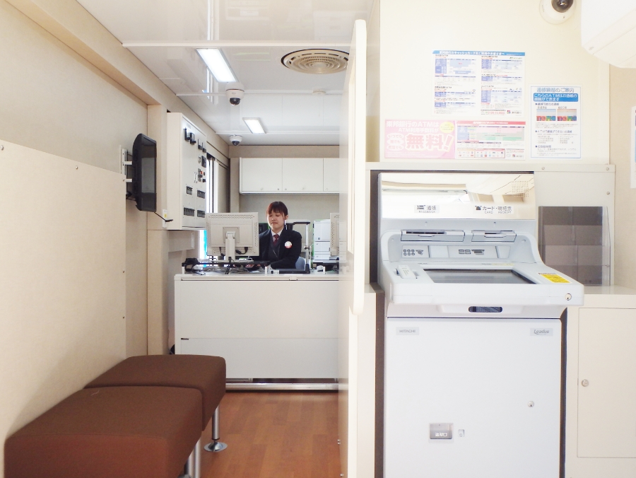 トラック型の荷台を業務スペースとして架装し、車内にATMと窓口(各種手続きの受付・相談)機能を集約した移動店舗車です。店舗休業や統廃合に伴うサービス継続に加え、来店が難しい地域を巡回して金融サービスを届けます。
