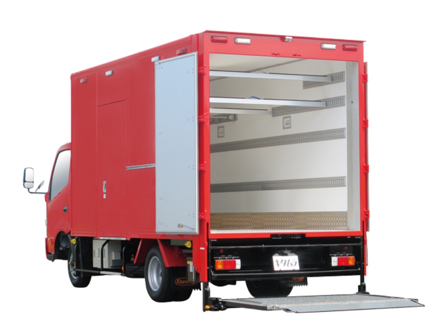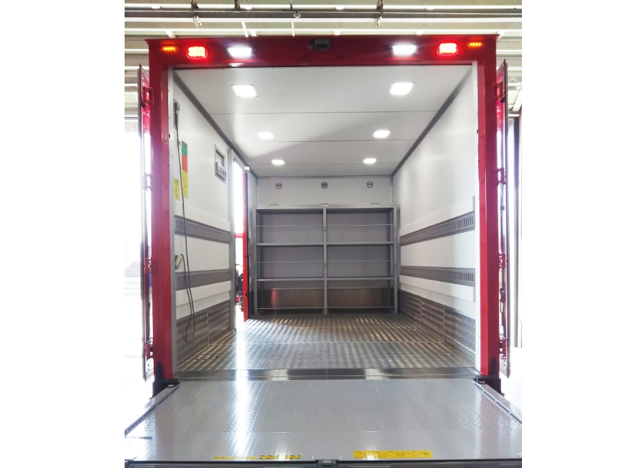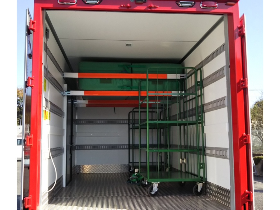 積載スペースに棚や固定用レールで資機材を整理・固定し、発電機や照明、救助用具、水防資機材などを“探さず取り出せる”配置にできます。出動準備を短縮し、パワーゲートと台車で重量物も安全に積み降ろしでき、到着後すぐに作業を開始できます。