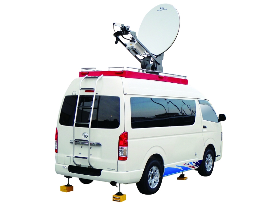 車両の屋根に搭載したアンテナで衛星と接続し、現場の映像・音声・データをリアルタイムに送信させます。