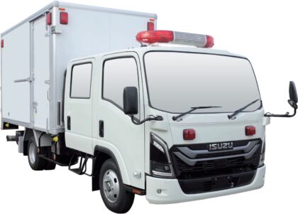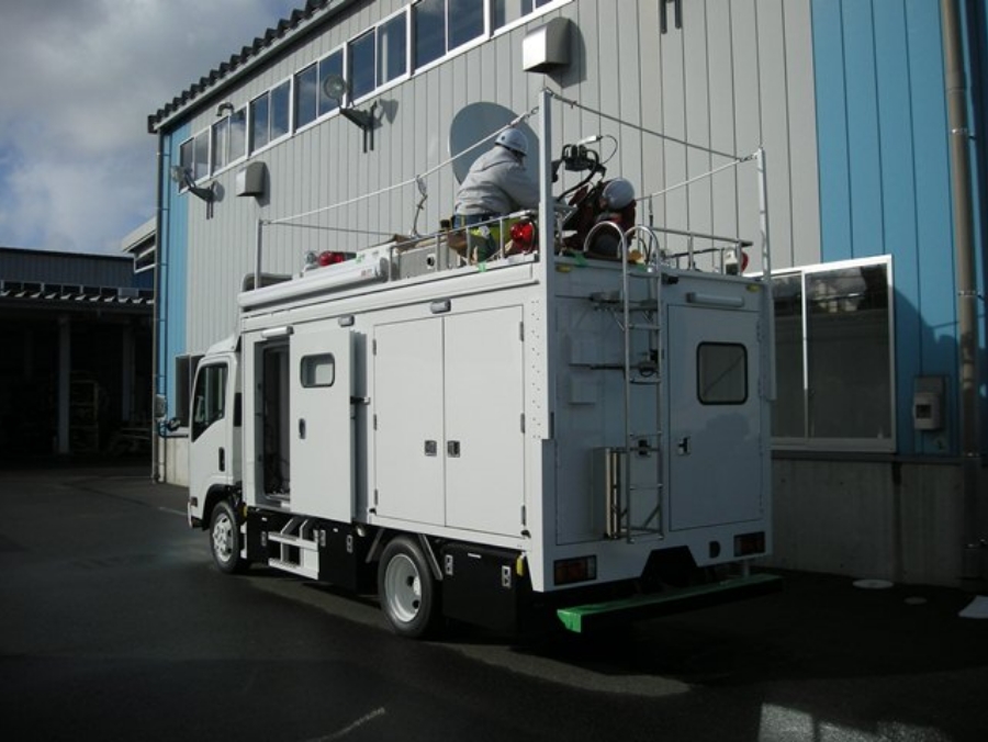 超軽量アルミ接着パネルと防振構造により精密機器を保護し、停電下でも安定した通信環境を確保。さらにバン型架装とすることで、将来的なシャシー交換や機器更新にも対応しやすく、長期運用を見据えた車両として整えます。