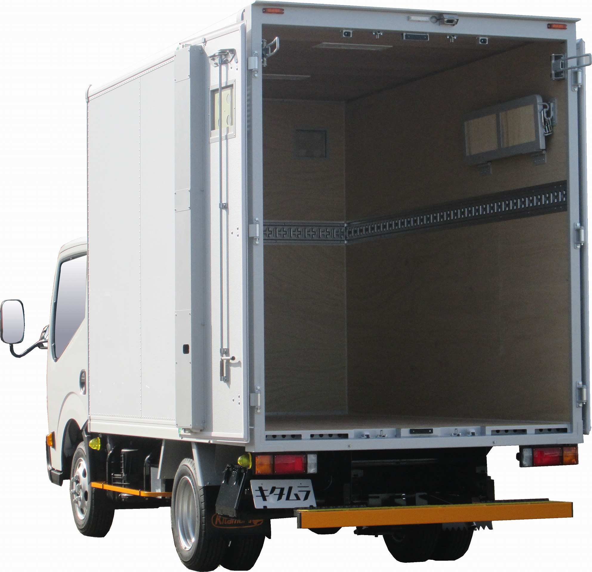 | 主要オプション | リア扉・両先開き、リアドア扉開閉確認警報装置・近接+Pランプ、室内棚(チェーン付き格納式)、ラッシングレール・フロント1段&サイド1段、90度ストッパー/切替式、車輪止め、バックカメラ/液晶ミラー7.0in |