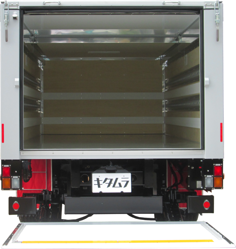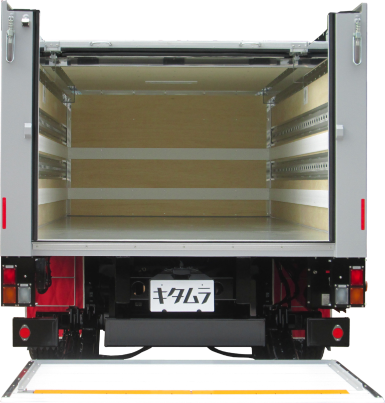 | 主要オプション | オートレベルリフト・能力650kg、キャスターストッパー/2分割タイプ、サイドストッパー/L材タイプ、キズ防止アルミ縞板/リフト裏面縦骨2本・リフト裏面先端、リフト作動時警告ブザー、リフト室外操作スイッチ/ステンレスボックス、ラッシングレール/アルミ十字埋込・サイド2段、プロテクター・デュラウッド/フロント2段・サイド2段、泥除けフラップ/EVAシート赤色・振れ止め付、ステンレス製工具箱、LEDサイドマーカー・5対、LED路肩灯・左右各1灯、中間フラッシャー/棒状タイプ・1対、バックカメラ/液晶ミラー7.0in |