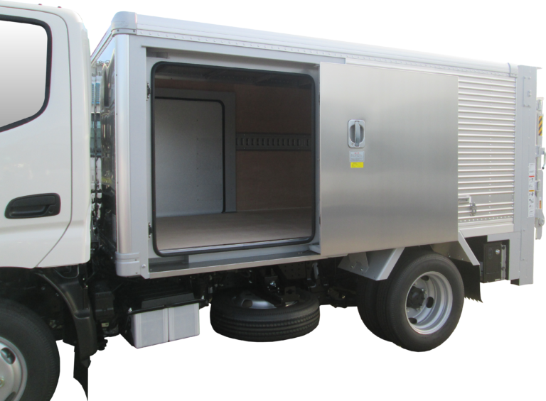 ビル内の車高制限への対応や、重量物を効率的に搬入するための作業環境が課題となっていました。当社は、左右スライド式サイド扉の採用により、狭所での積み降ろしを容易にし、ペットリフトやキャスターストッパーなどの安全装備を組み合わせることで、重量物搬送のリスクを低減し、作業性と安全性を両立する車両を実現しました。