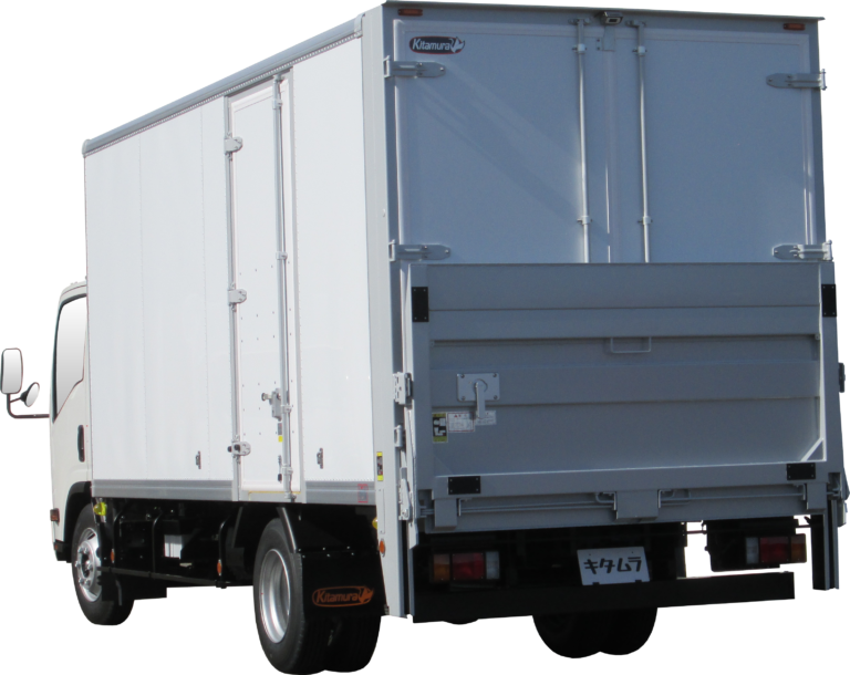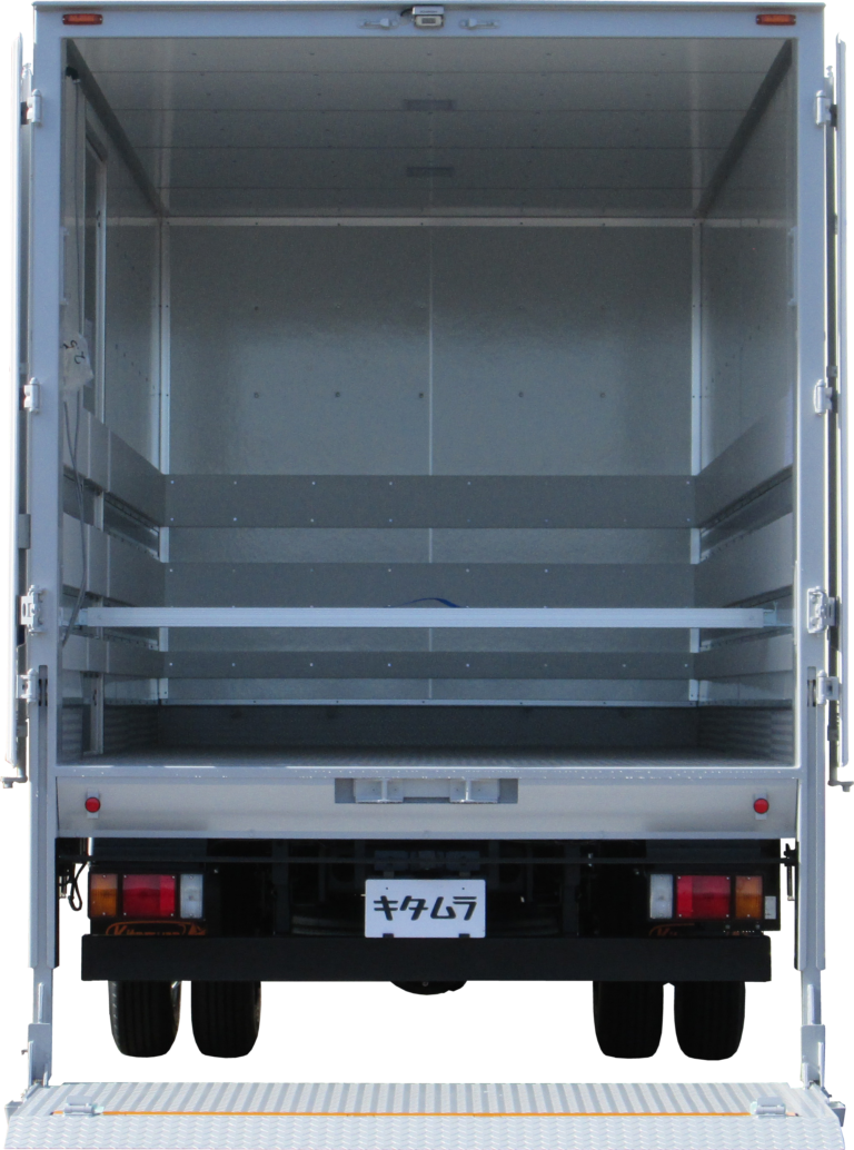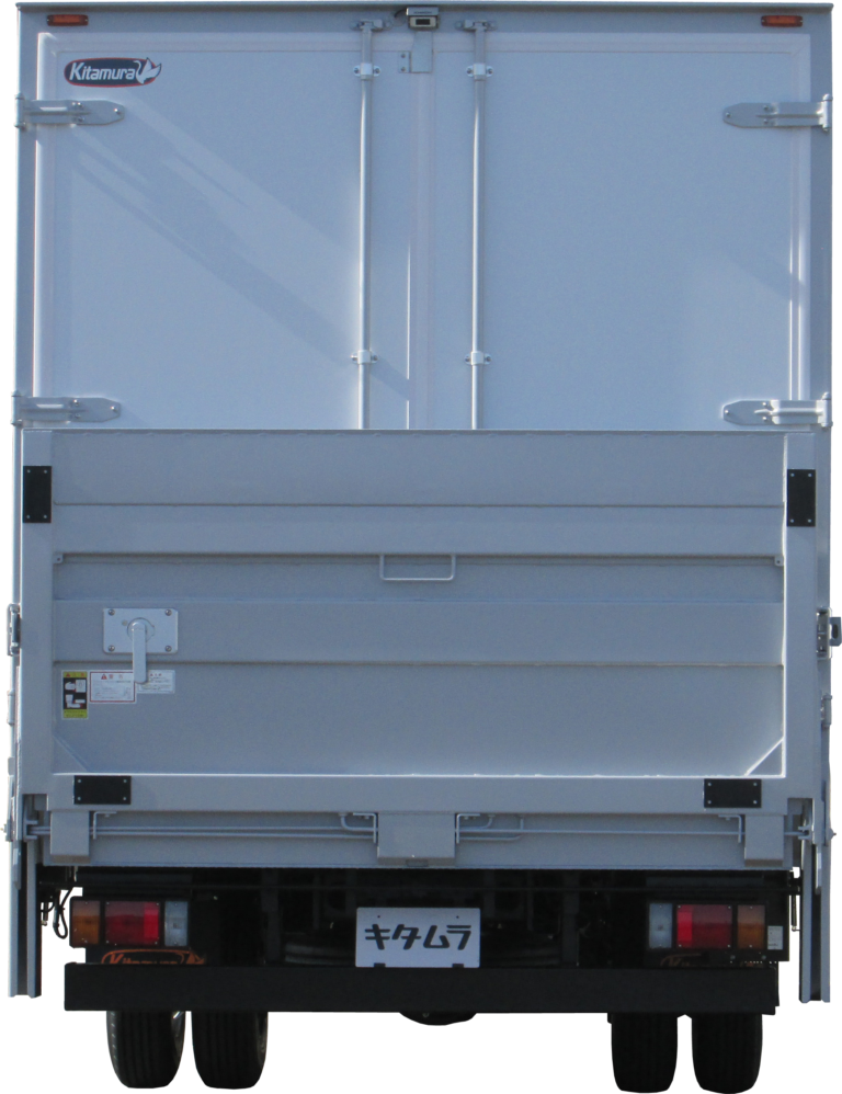 | 主要オプション | 左サイド扉/片開き式・前丁番、左サイド扉/位置変更、ペットリフト後立掛式・能力600kg、キャスターストッパー/1本タイプ、導風板、プロテクター・デュラウッド/フロント3段・サイド3段、ラッシングレール/アルミ埋込・サイド2段、ラッシングビーム/1本、床/ステン縞板2.5t、水抜き穴/前2ケ、バックカメラ/液晶ミラー6.1in・シャッター有り、下廻り/防錆塗装 |