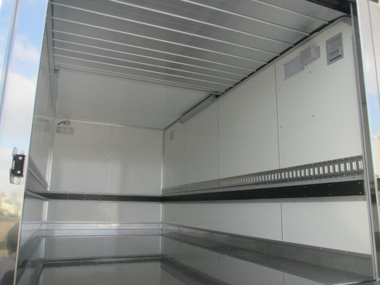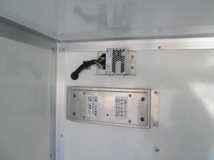 学校給食用コンテナの積み降ろしでは重量物の取り扱いが多く、安全確保と作業負担の軽減が求められていました。また、衛生管理や温湿度管理など、食品を扱う車両としての環境面への配慮も課題となっていました。当社は、フリーチルトリフト(VF10)やキャスターストッパー、L型サイドストッパーなど安全装備を搭載し、安定した荷役作業を実現。さらに、UVオゾン発生器や温湿度計、外部電源コンセントなどを組み合わせ、衛生面と運用効率を高める給食配送車を製作しました。