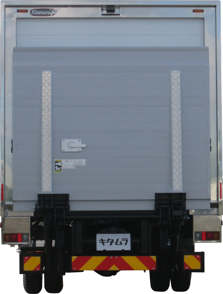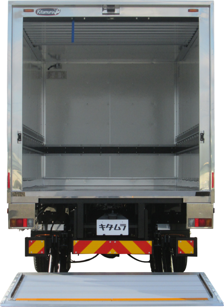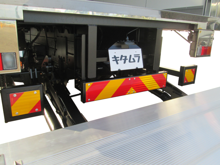 | 主要オプション | フリーチルトリフト後立掛式・能力1000kg、キャスターストッパー/2分割タイプ、サイドストッパー/L材タイプ、キズ防止アルミ縞板/リフト裏面縦骨2本、プロテクター/ステンハット材+板ゴム/フロント・サイド1段、ラッシングレール/ステン露出・サイド1段、ラッシングベルト/重荷重ラチェット式3本、ラッシングベルト掛け取付、タオル収納BOX取付、UVオゾン発生器、床下外部電源用コンセント(BOX入)取付/100V用、デジタル温湿度計取付、水抜き穴/前2ケ、水抜き穴用ゴム栓・2対、ドックシェルター用リヤ角パイプ、シャッター扉部/白塗装、シャシ防錆塗装、リフト作動時警告ブザー、ステンレス製/サイドバンパー・リアフェンダー・工具箱・テールランプガード、バックカメラ/液晶ミラー7.0in・シャッター有り |