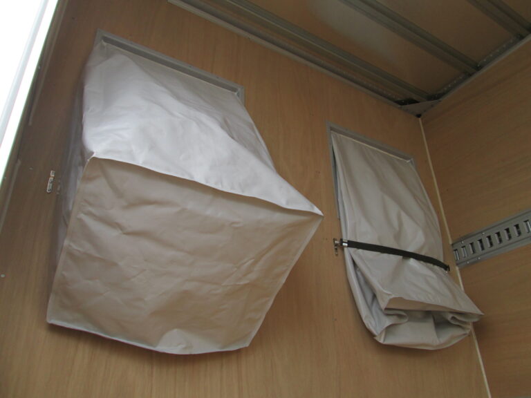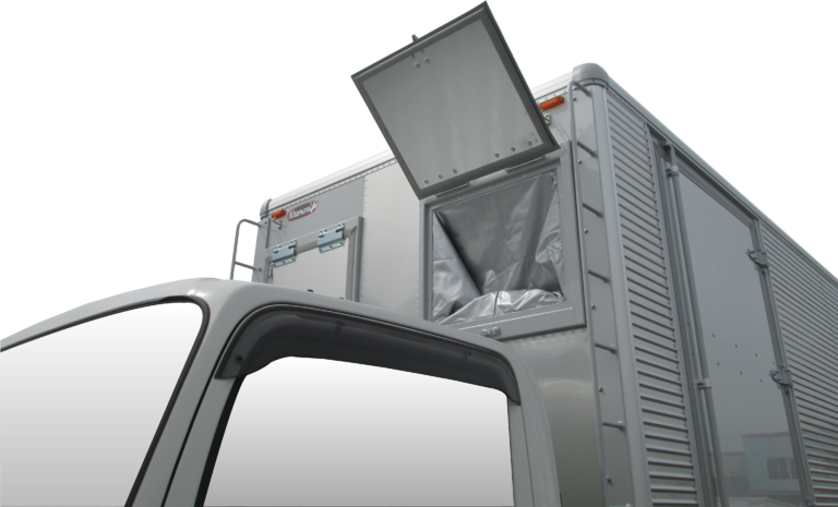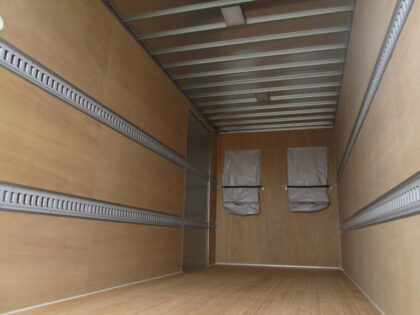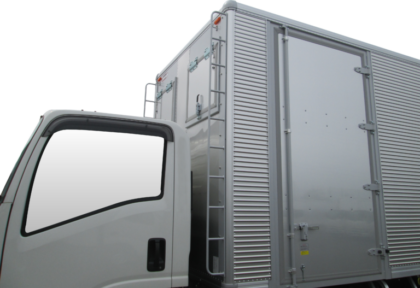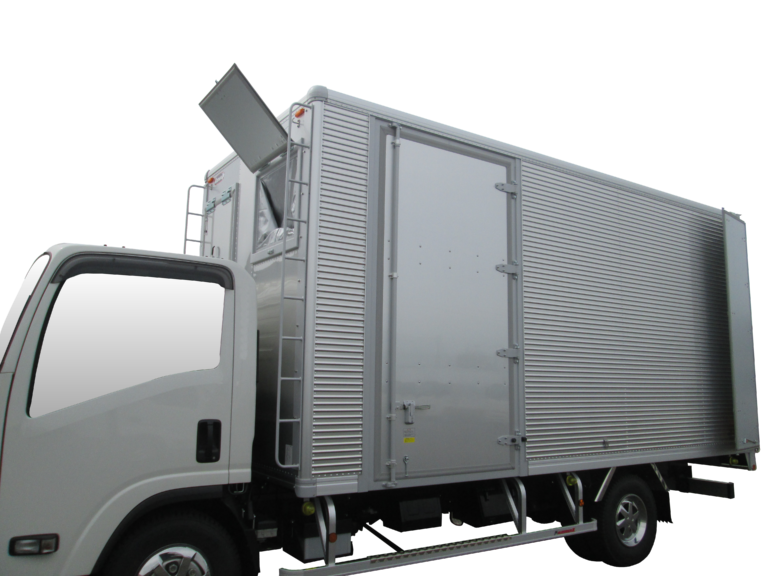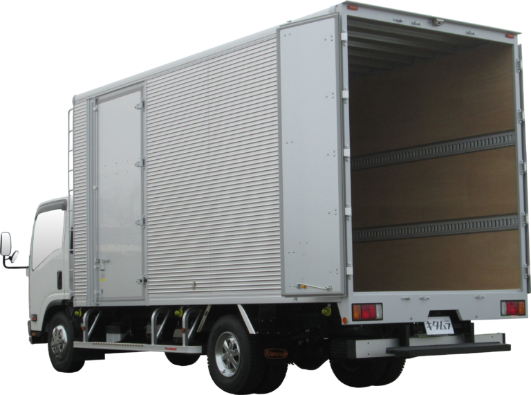 多品目の貨物輸送を行う中で、積み降ろし時の作業効率向上や安全性の確保が求められていました。多品目の貨物輸送を行う中で、積み降ろし効率化と安全性の向上が求められていたため、荷室内での確実な固定が課題となっていました。当社は、上丁番式のベントドアや梯子の追加、サイド扉の開口幅調整に加え、I型ラッシングレール2段などを装備したアルミバンを製作。これにより荷扱いの安全確保と効率化に寄与しています。
