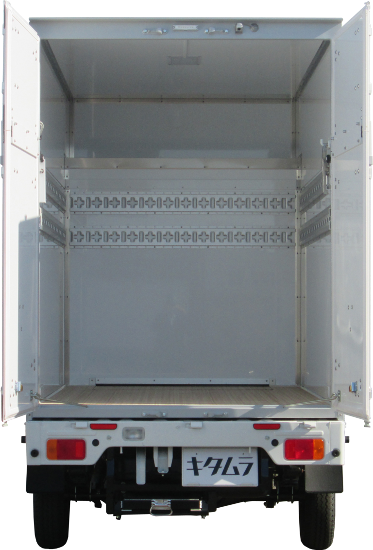 | 主要オプション | フロント角出し仕様、リヤ2枚観音扉/特殊形状、接着バン仕様、リヤワンタッチスライド式ステップ、ラッシングレール/I+I型アルミ露出・フロント2段・サイド2段、バックカメラ |