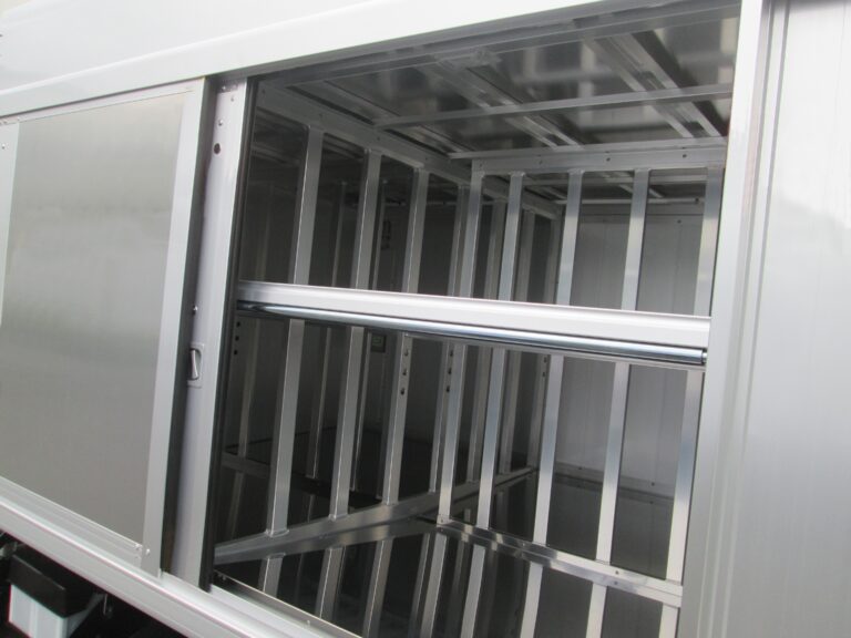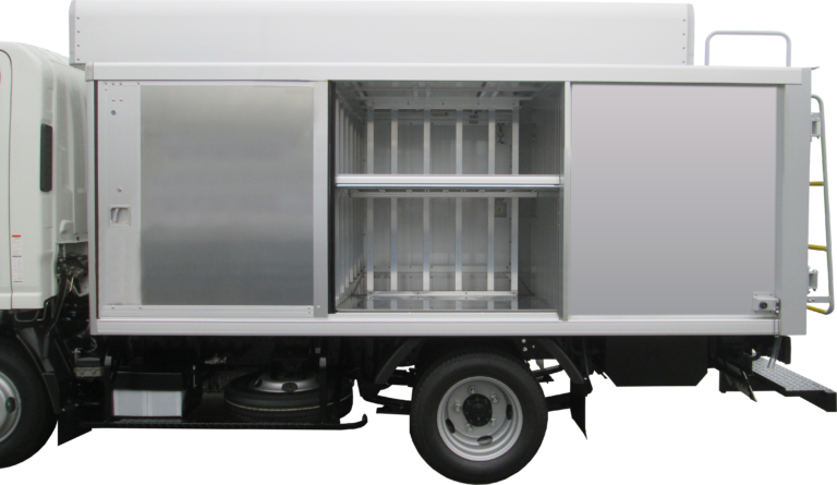 自動販売機向けの商品配送では、頻繁な積み降ろし作業に加え、飲料の種類ごとに異なる温度帯を維持しながら効率よくルート配送を行う必要がありました。当社は、5室構成の庫内に後室冷凍機と断熱仕様を施し、温度管理の精度を向上。また、保冷カーテンや雨よけ板、110度ストッパーを装備することで作業の安全性と効率性を両立しました。さらに台車格納ボックスやバックカメラ等の装備により、荷役性と走行時の安全支援を強化したボトルカーを実現しています。